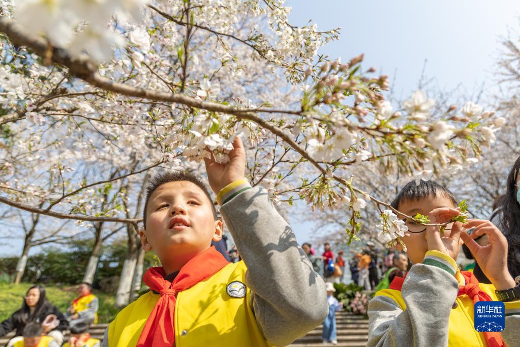 3月14日,重庆市特殊教育中心的视力障碍学生在重庆市南山植物园轻轻触摸花朵、闻花香。