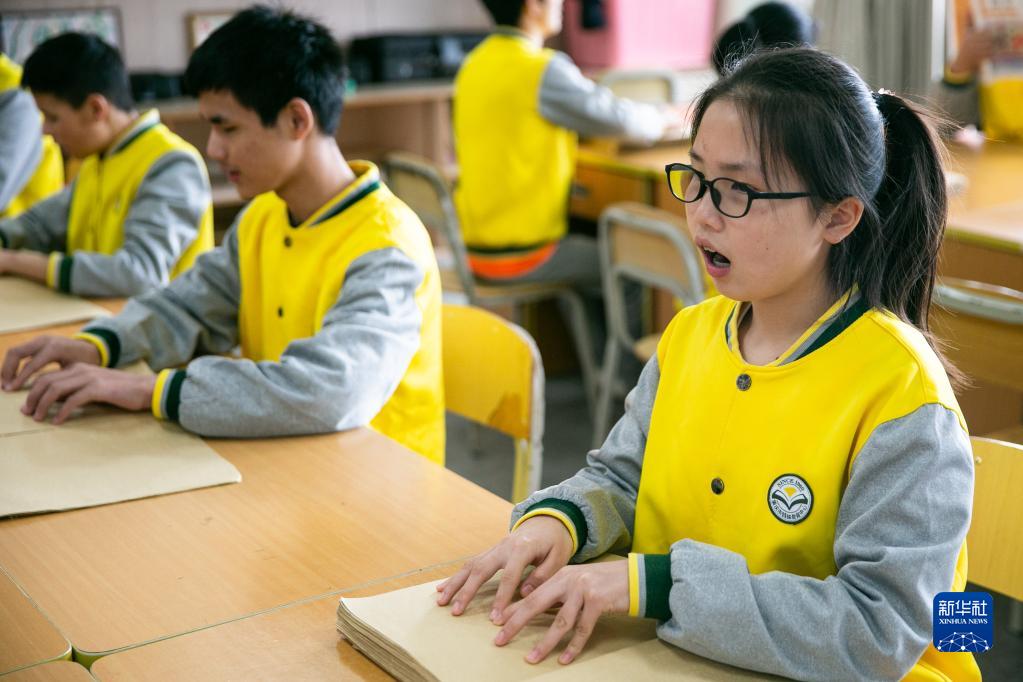 3月31日,重庆市特殊教育中心的视力障碍学生在教室内朗读古诗。