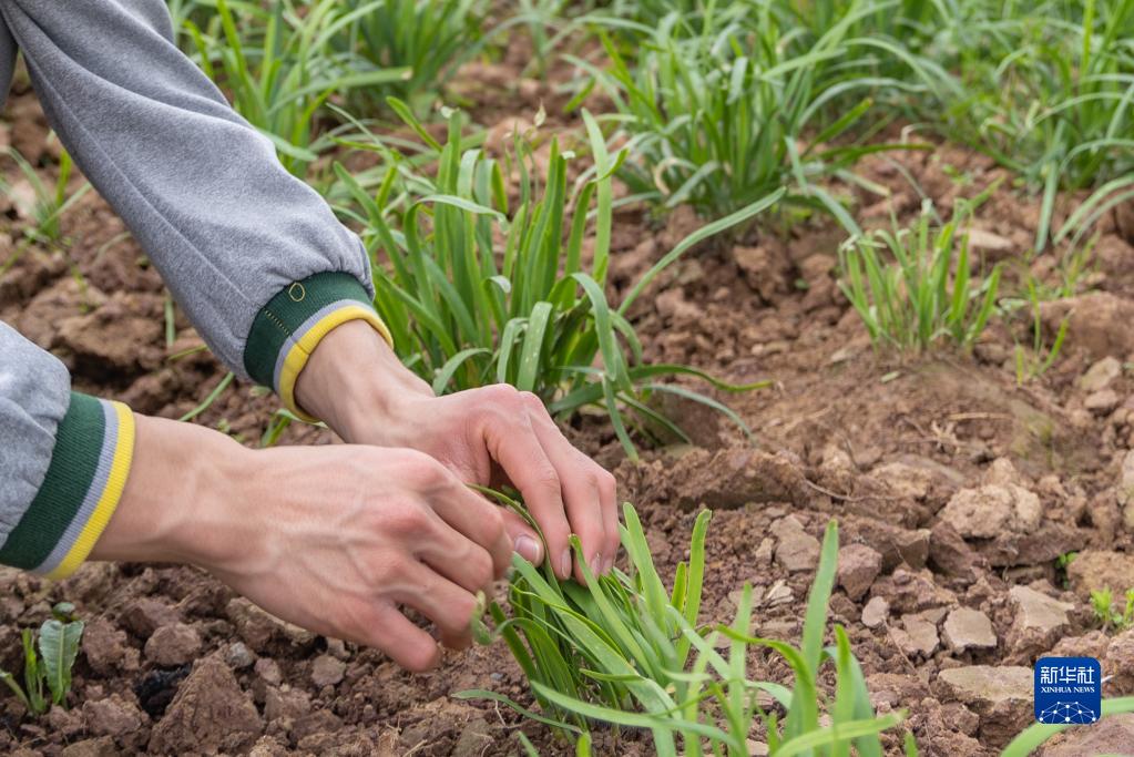 3月31日,在重庆广阳岛,重庆市特殊教育中心的视力障碍学生在轻轻触摸种植在地里的韭菜。