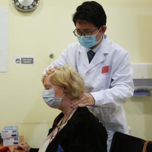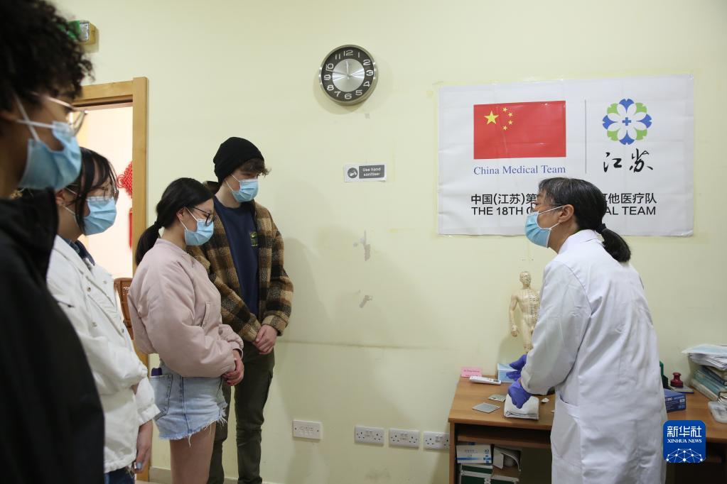 4月5日,在马耳他保拉市地中海地区中医中心,中国第18期援马耳他医疗队成员给学生讲解针灸治疗。