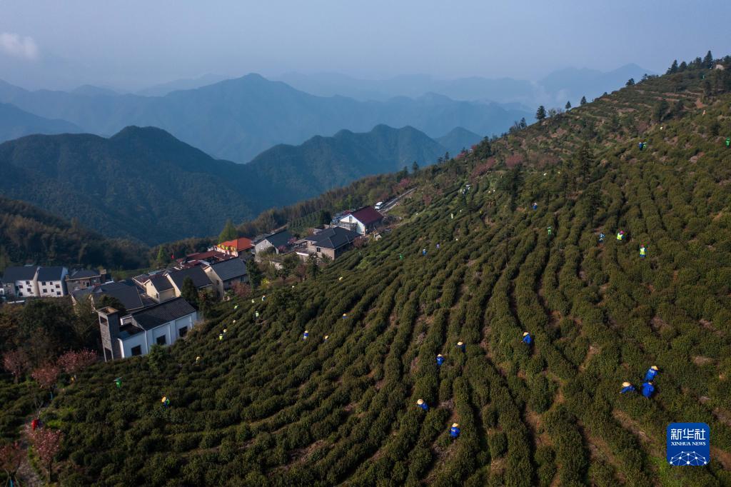 4月7日,安顶村的茶农在采摘安顶云雾茶(无人机照片)。
