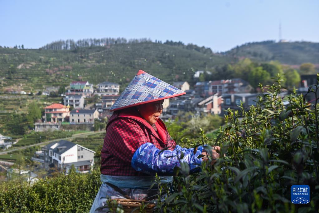 4月7日,安顶村的茶农在采摘安顶云雾茶。