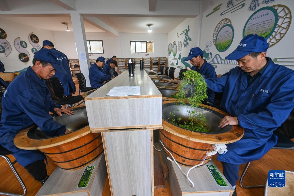 4月7日,工作人员在安顶村的共富工坊内炒制安顶云雾茶。