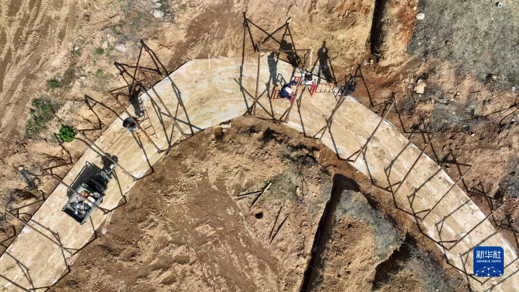 4月7日,在邢台市信都区会宁镇张尔庄村葫芦生态种植园,村民在搭建葫芦藤架(无人机照片)。