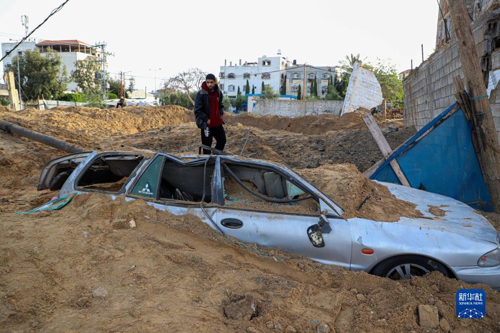 4月7日,一名男子在加沙城查看以色列军队空袭后的车辆残骸。