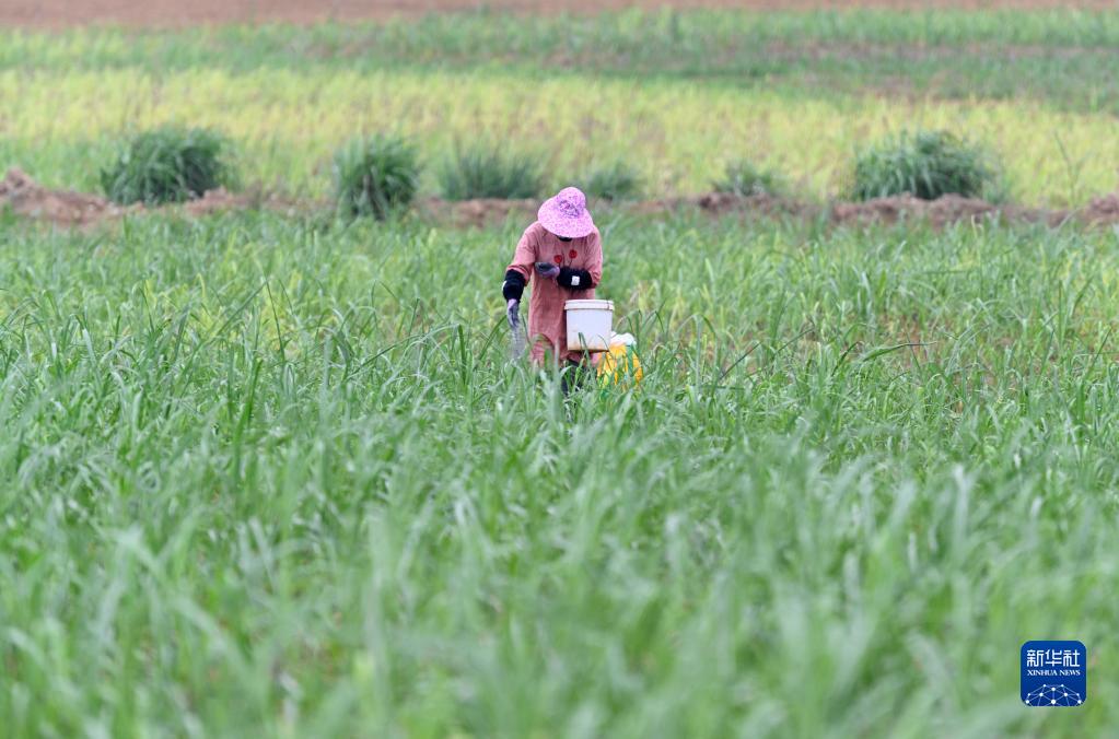 4月7日,在柳州市柳江区穿山镇思荣村,农民在蔗田里忙碌。