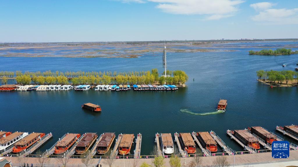 4月7日,处于试运营阶段的白洋淀“水上巴士”项目画舫船在白洋淀内行驶(无人机照片)。