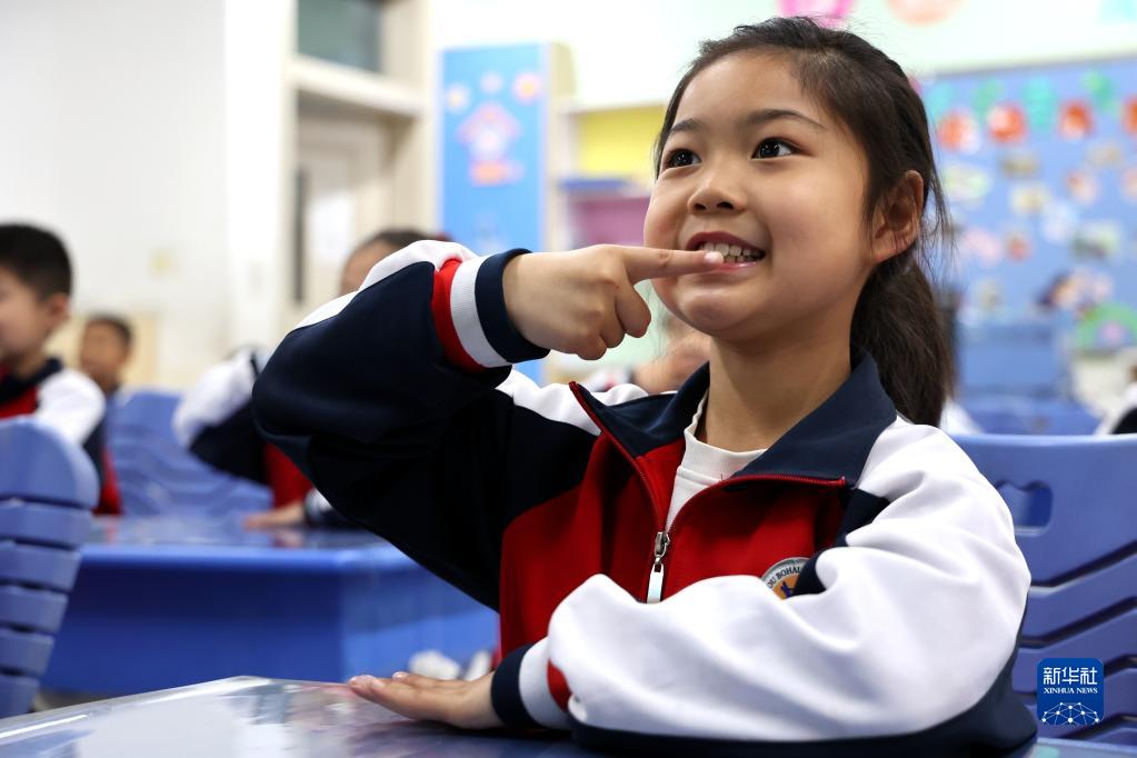 4月7日,山东省滨州市渤海中学南校区的学生在学习正确的刷牙方式。