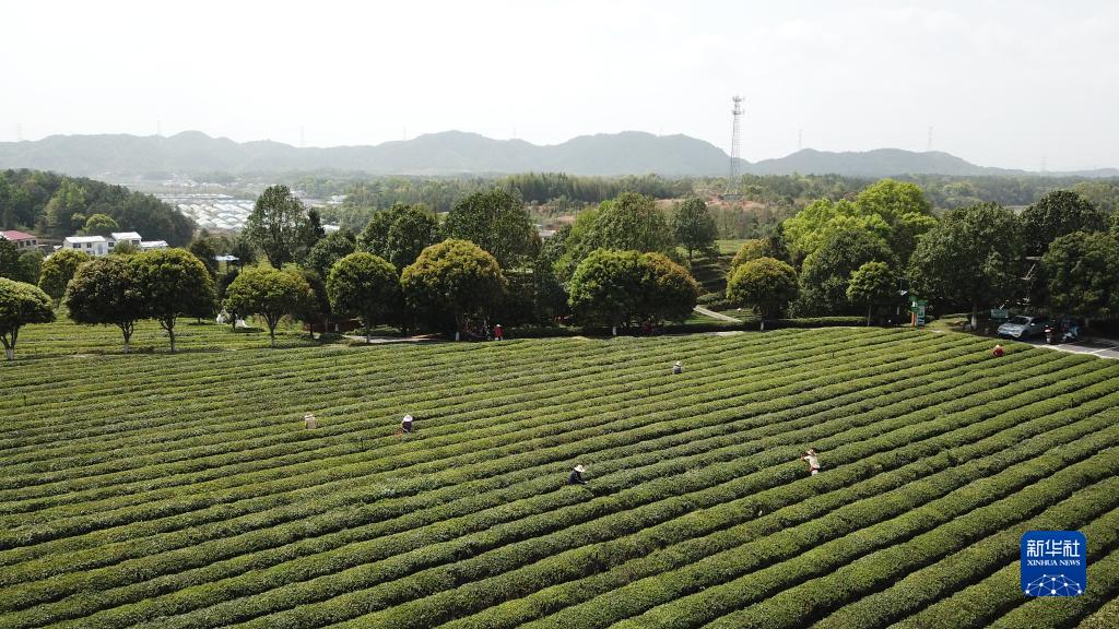 4月7日,茶农在湖南省长沙市长沙县金井镇的金井茶旅融合产业园采茶(无人机照片)。