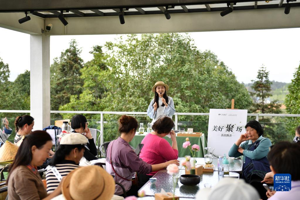 4月7日,工作人员在湖南省长沙市长沙县金井镇的金井茶旅融合产业园向游客科普茶文化。