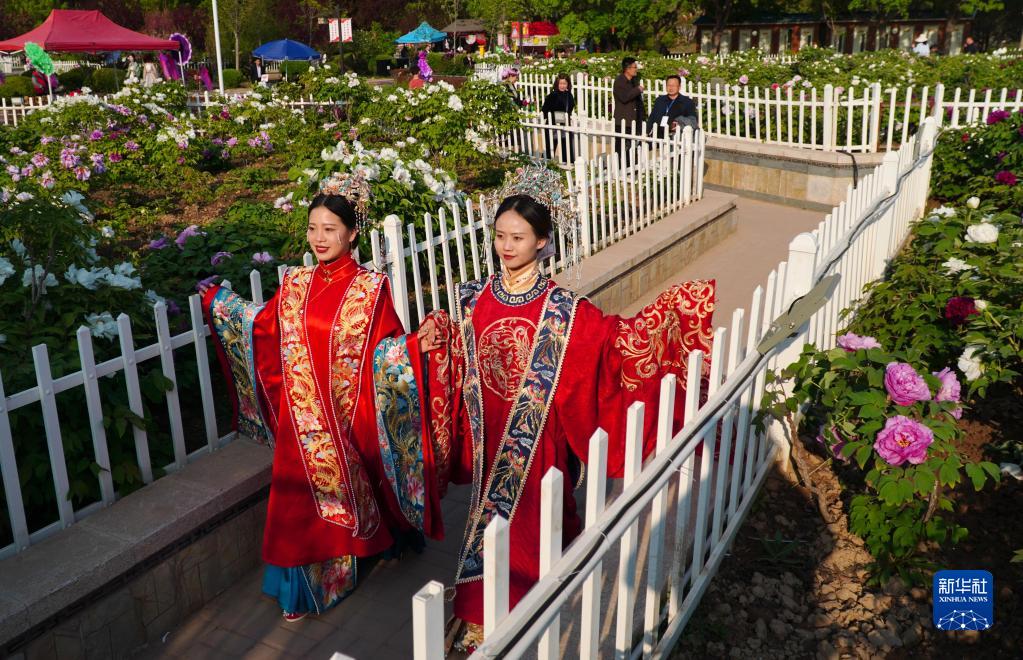 4月7日,游客在山东省菏泽市牡丹区的曹州牡丹园游玩。