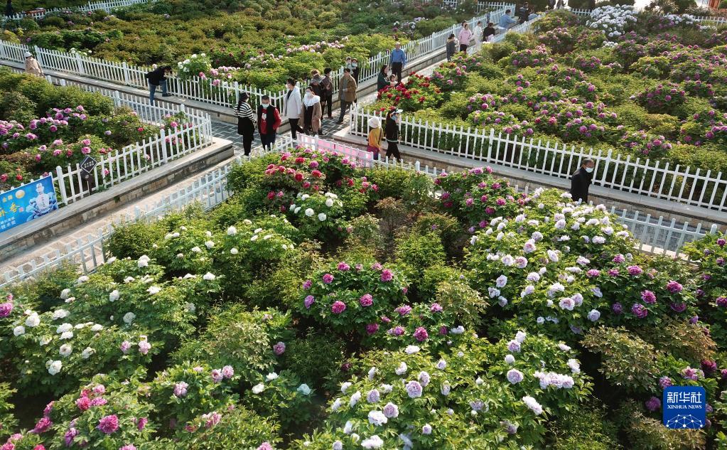 4月7日,在山东省菏泽市牡丹区的曹州牡丹园,游客在观赏牡丹花(无人机照片)。
