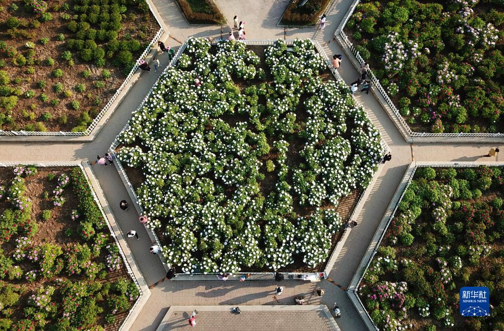 4月7日,在山东省菏泽市牡丹区的曹州牡丹园,游客在观赏牡丹花(无人机照片)。