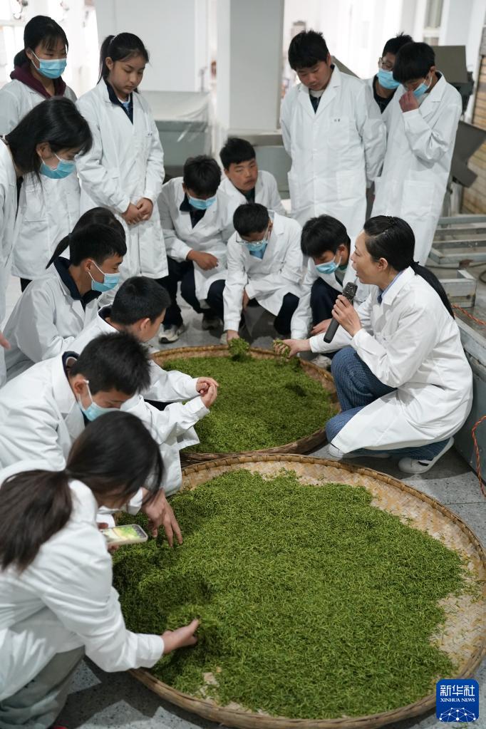 3月29日,安康市紫阳县职业教育中心茶叶专业的学生在该县一家茶厂学习茶叶鲜叶的干燥工艺。