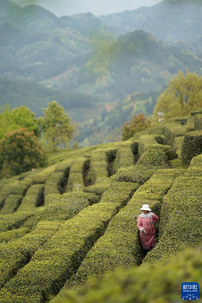 4月5日,茶农在汉中市南郑区牟家坝镇一处茶园采摘茶叶。