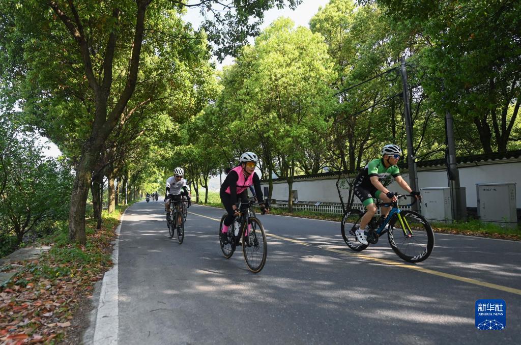4月8日,骑行爱好者在浙江省诸暨市赵家镇香榧国家森林公园参加健身骑行活动。