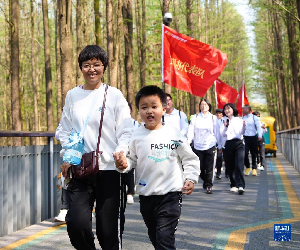 4月8日,市民在青山湖绿道参加第35个爱国卫生月毅行活动。