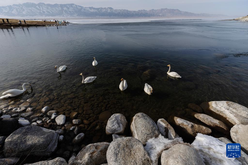 4月6日,几只天鹅在赛里木湖游弋。