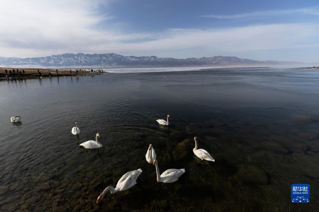 4月6日,几只天鹅在赛里木湖游弋。