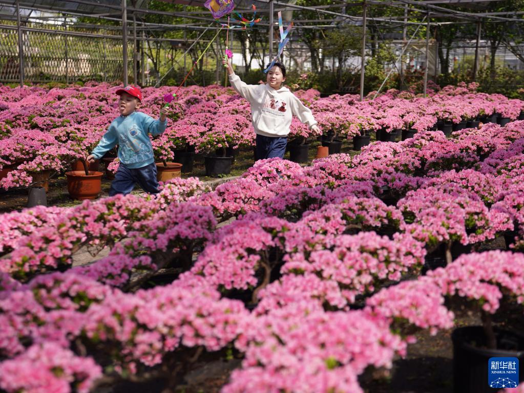 4月8日,小朋友在嘉善县大云镇碧云花园的造型杜鹃盆景区玩耍。