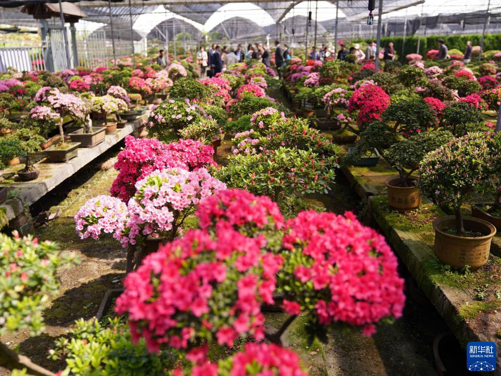 4月8日,游客在嘉善县大云镇碧云花园的精品杜鹃盆景坊内参观。