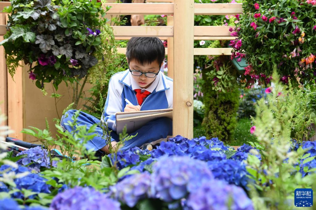 4月8日,在2023粤港澳大湾区花展现场,一名小朋友在写生。