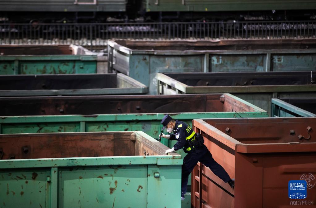 4月4日凌晨,阿拉山口出入境边防检查站的崔洪武在进行车体查缉工作。