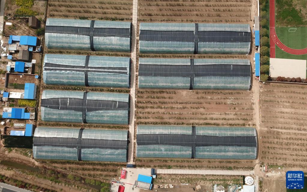 4月8日拍摄的一处位于山东省成武县南鲁集镇的大棚樱桃种植园(无人机照片)。