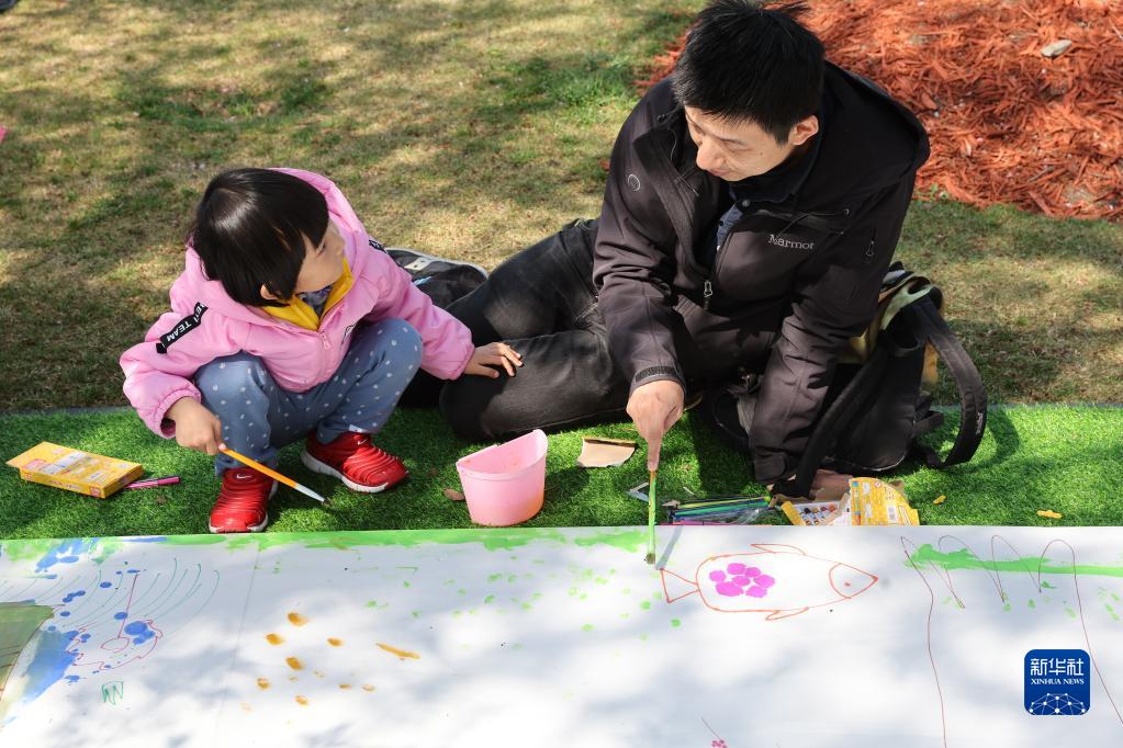 4月8日,家长和孩子在上海市宝山区顾村公园“樱画书艺”活动上创作。
