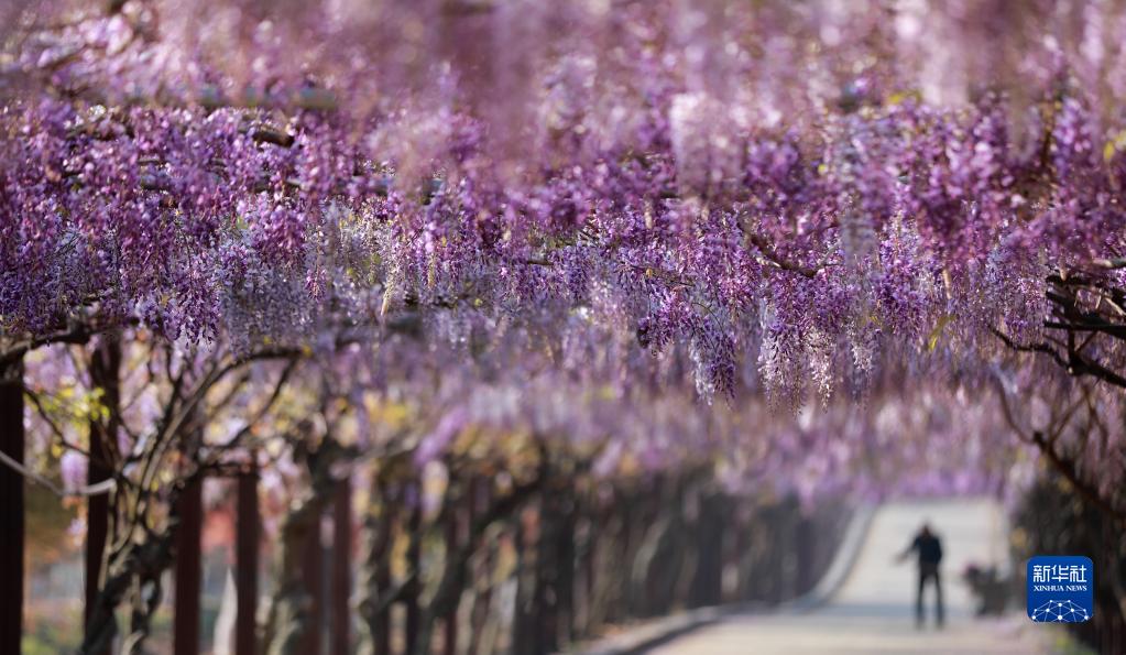 4月8日,游客在江苏省句容市后白镇紫藤长廊下赏花休闲。