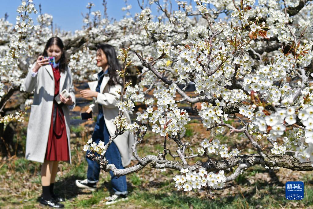 4月8日,游客在山东省烟台市福山区高疃镇肖家沟村梨园拍照。