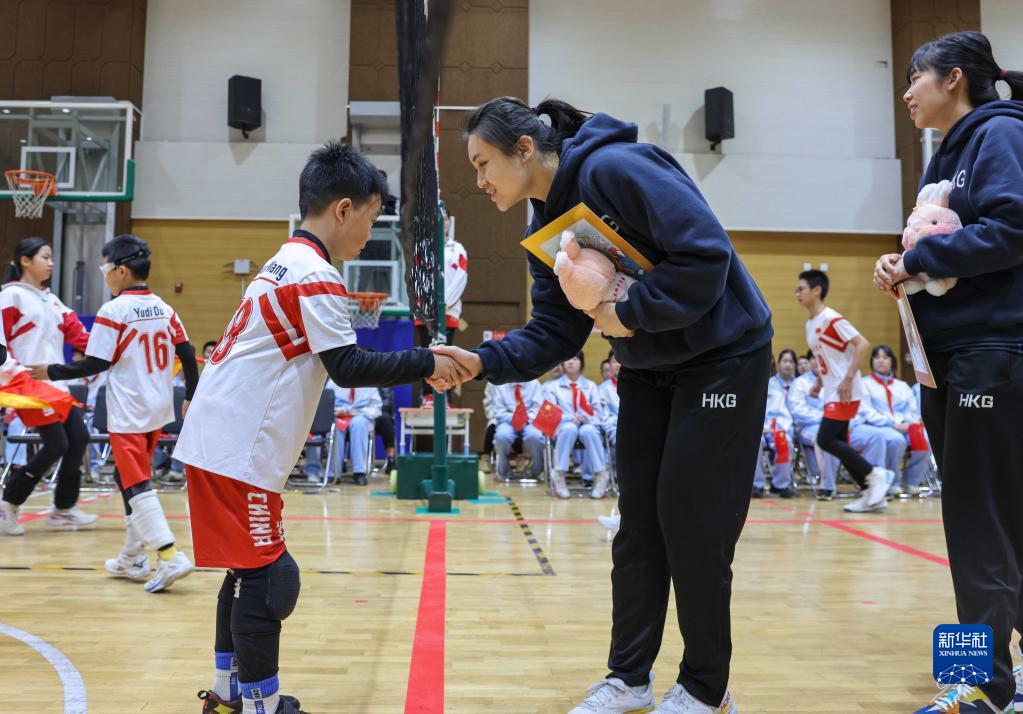 4月6日,人大附中分校小学部排球队员和香港女排队员在友谊赛前握手。
