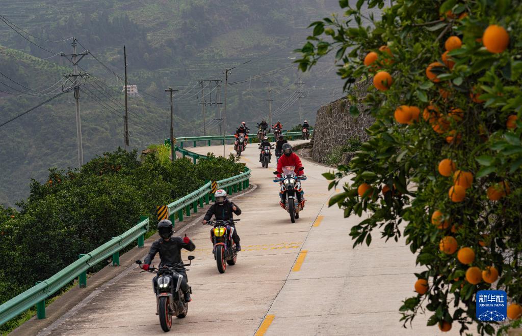 4月7日,摩托车爱好者在秭归县水田坝乡橙园公路体验骑行乐趣。