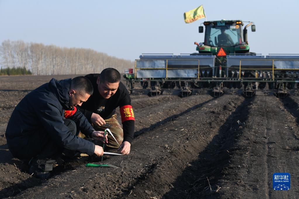 4月8日,在位于黑龙江省北安市的北大荒集团建设农场有限公司第四管理区一处农田,农业技术员在监测施肥作业质量。