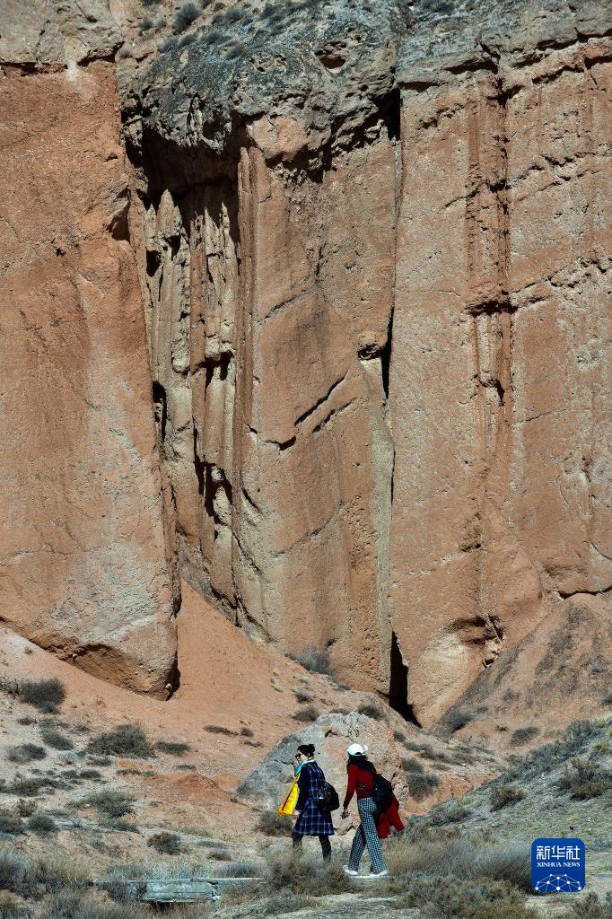 4月8日,游客行走在青海贵德国家地质公园丹霞地貌间。