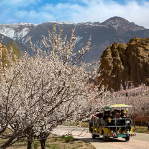 春暖花开的季节,位于青海省海南藏族自治州贵德县的贵德国家地质公园迎来春游的游客,盛开的春花与丹霞地貌、雪山构成一幅美丽的高原春色图。