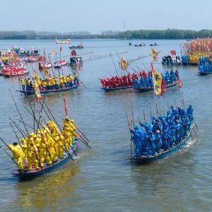 当日,2023年泰州姜堰溱潼会船节在江苏省泰州市姜堰区溱湖国家湿地公园开幕,数百条船只和万余名会船选手云集溱湖,演绎历久弥新的民俗画卷。