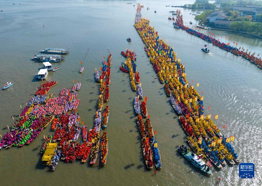 当日,2023年泰州姜堰溱潼会船节在江苏省泰州市姜堰区溱湖国家湿地公园开幕,数百条船只和万余名会船选手云集溱湖,演绎历久弥新的民俗画卷。