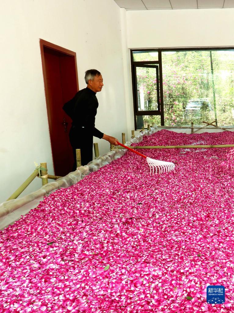 4月9日,在四川省眉山市仁寿县藕塘镇,村民在晾晒玫瑰花。