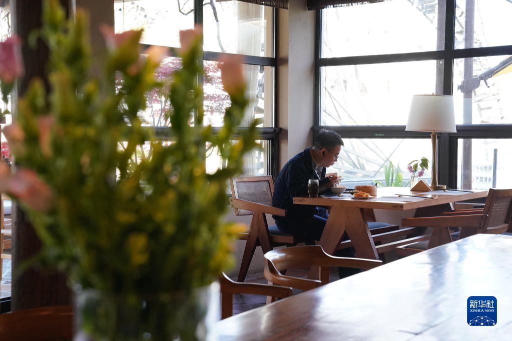 4月10日,一位客人在黟县碧阳镇的山水间·黑多白少民宿吃早餐。