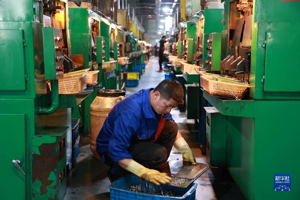 4月10日,搬迁群众在独山县望城社区安置点附近的轴承产业园区内生产轴承。