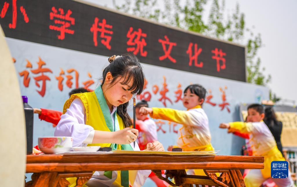 当日,以“徜徉诗词之海,品味文韵之美”为主题的传统文化节在天津小学举行。学生们在老师的指导下参与国学朗诵、京剧选段表演、书画展示等活动,感受传统文化的魅力。