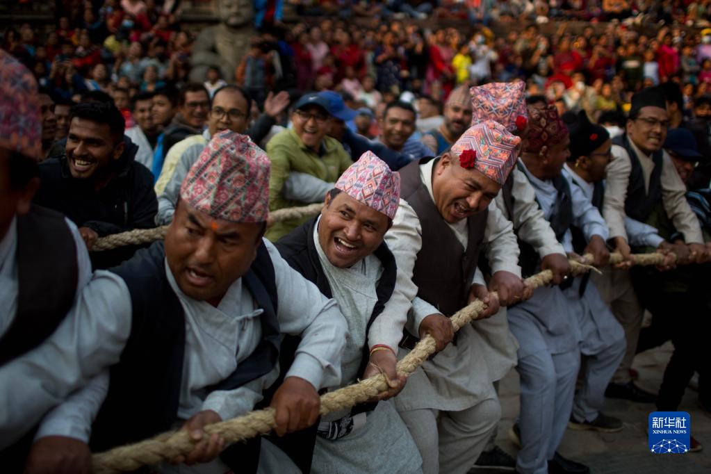 4月10日,在尼泊尔中部加德满都谷地的巴克塔普尔,参加新年庆典的人们在传统的庆祝活动上合力拖拽巨大的神像战车。