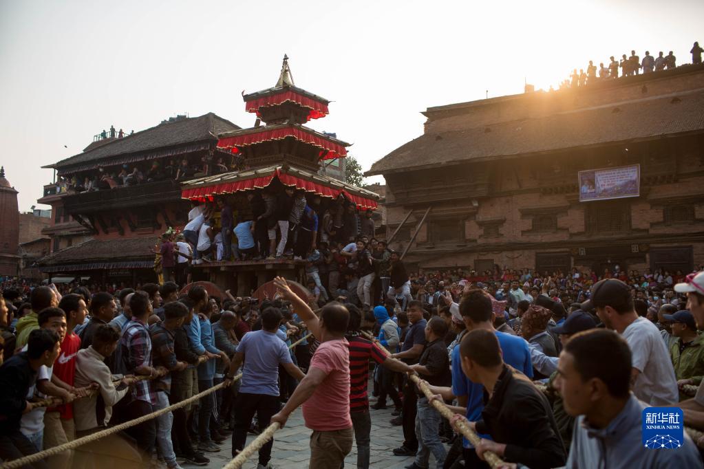 4月10日,在尼泊尔中部加德满都谷地的巴克塔普尔,参加新年庆典的人们在传统的庆祝活动上合力拖拽巨大的神像战车。