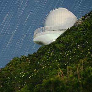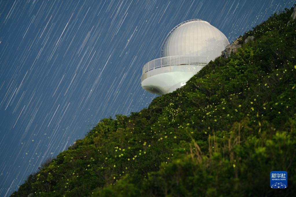 位于西涌社区的深圳市天文台以及萤火虫与星空(堆栈照片,2021年7月7日摄)。
