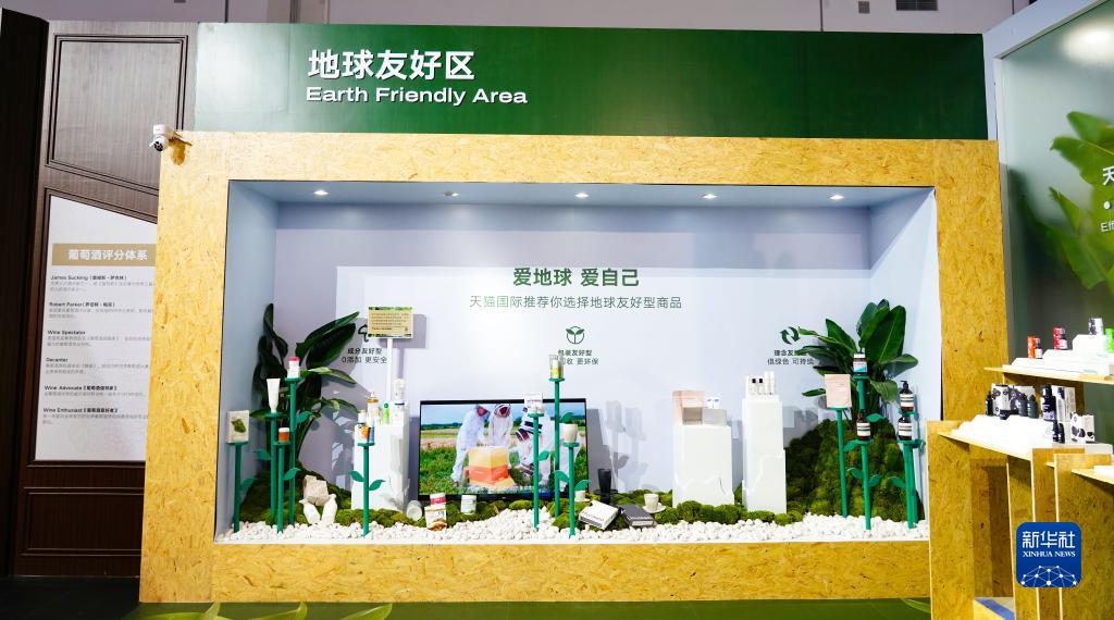 这是天猫国际展台展示的地球友好型商品,商品包装均为可回收材料制成(4月11日摄)。
