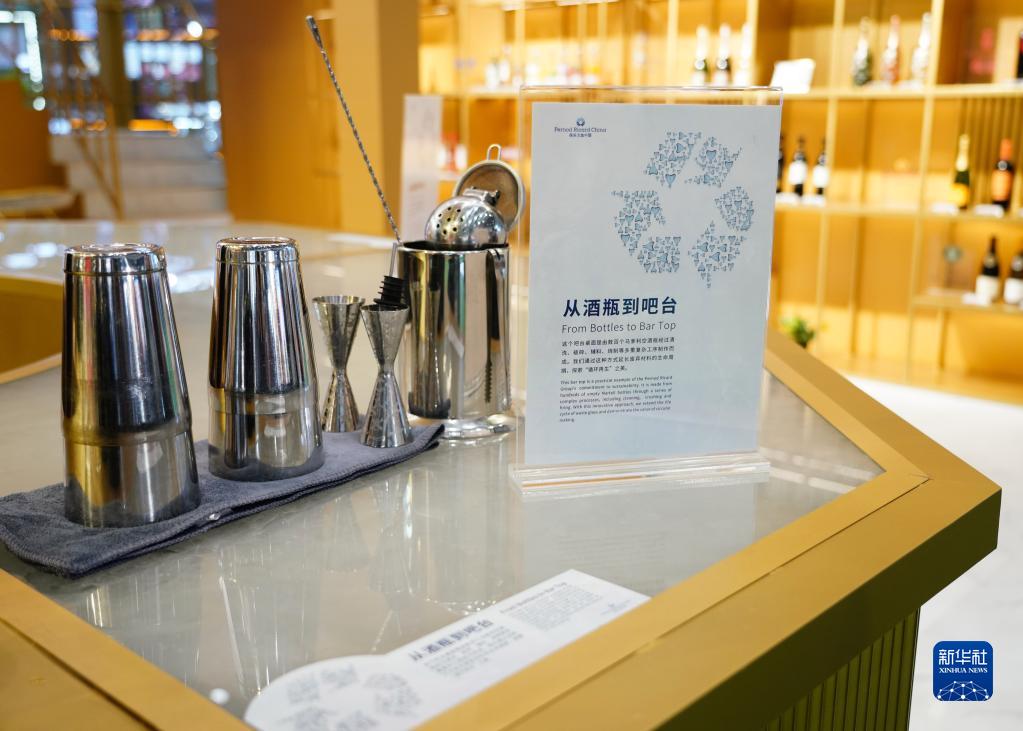 这是保乐力加中国展台展示的由废弃空酒瓶制作的循环再生吧台(4月10日摄)。