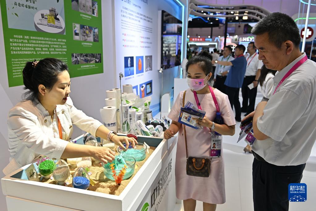 4月11日,消博会海南展台的工作人员向媒体记者介绍快速降解材料和降解过程。