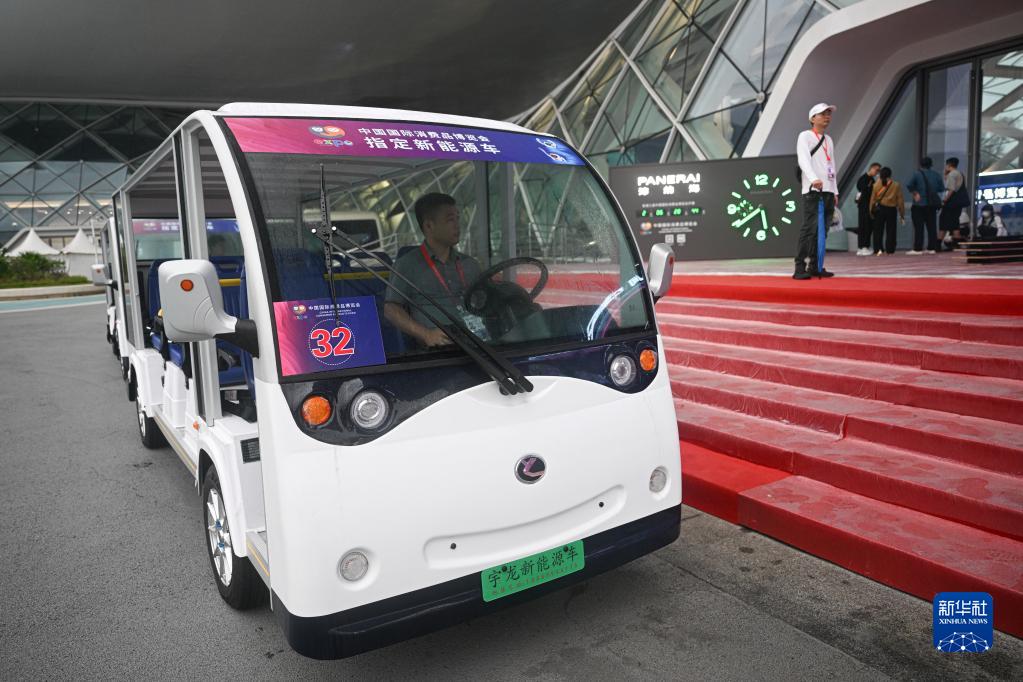 在消博会场馆外拍摄的新能源摆渡车(4月8日摄)。