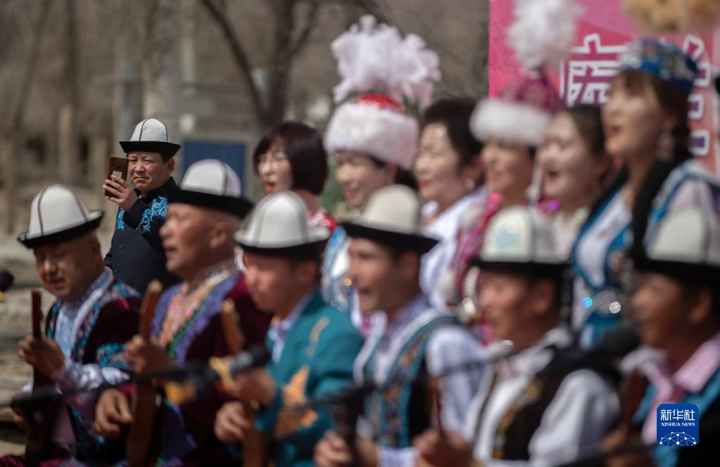 4月10日,在别迭里村,阿不都别克在等待上场演出时用手机拍摄其他艺人的演出。